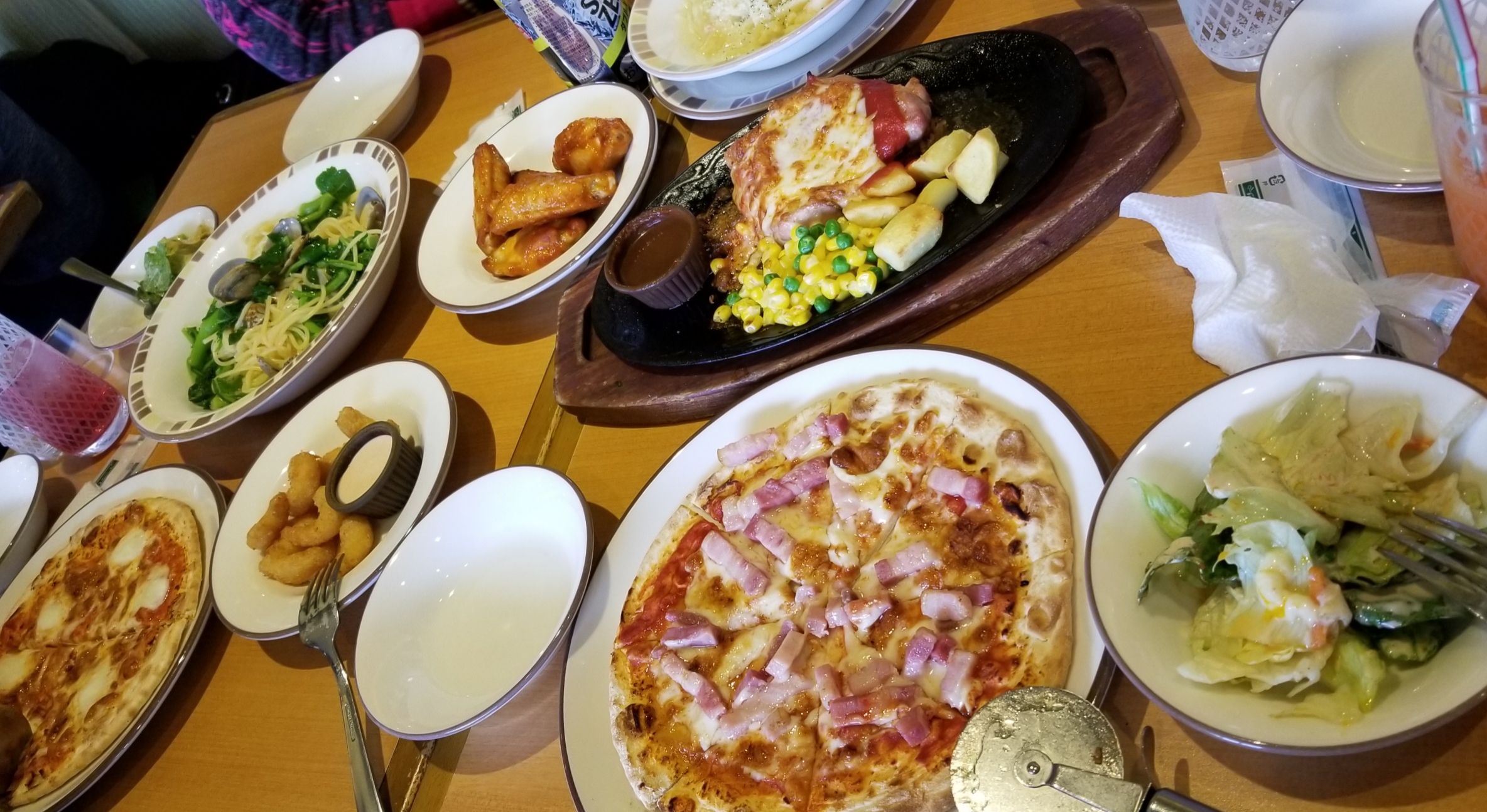 注文したのがいっぺんに来たのでサイゼリアとは思えないゴージャス感