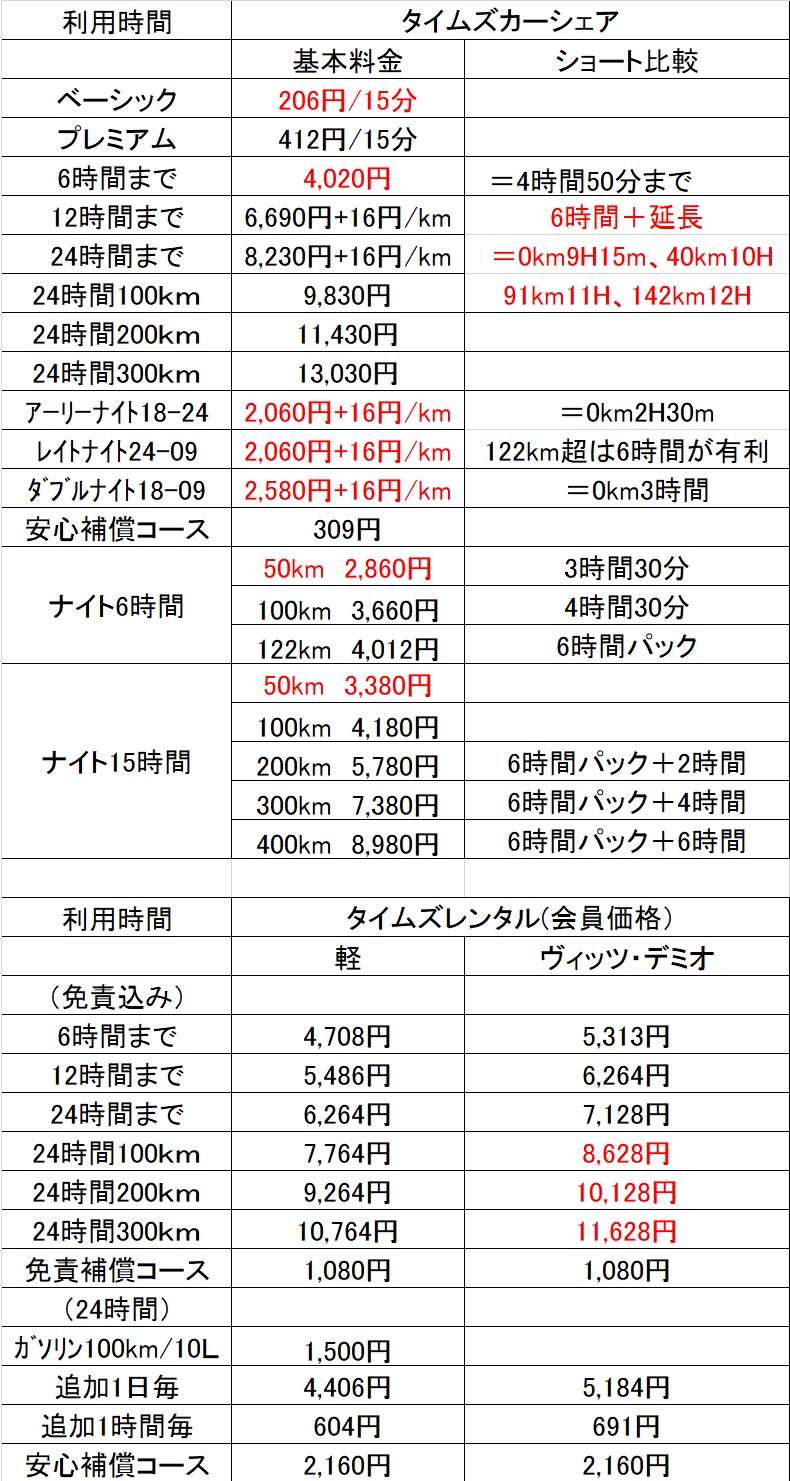 2.12時間パックとタイムズレンタカーの境目(会員割引20%あるので大きい)