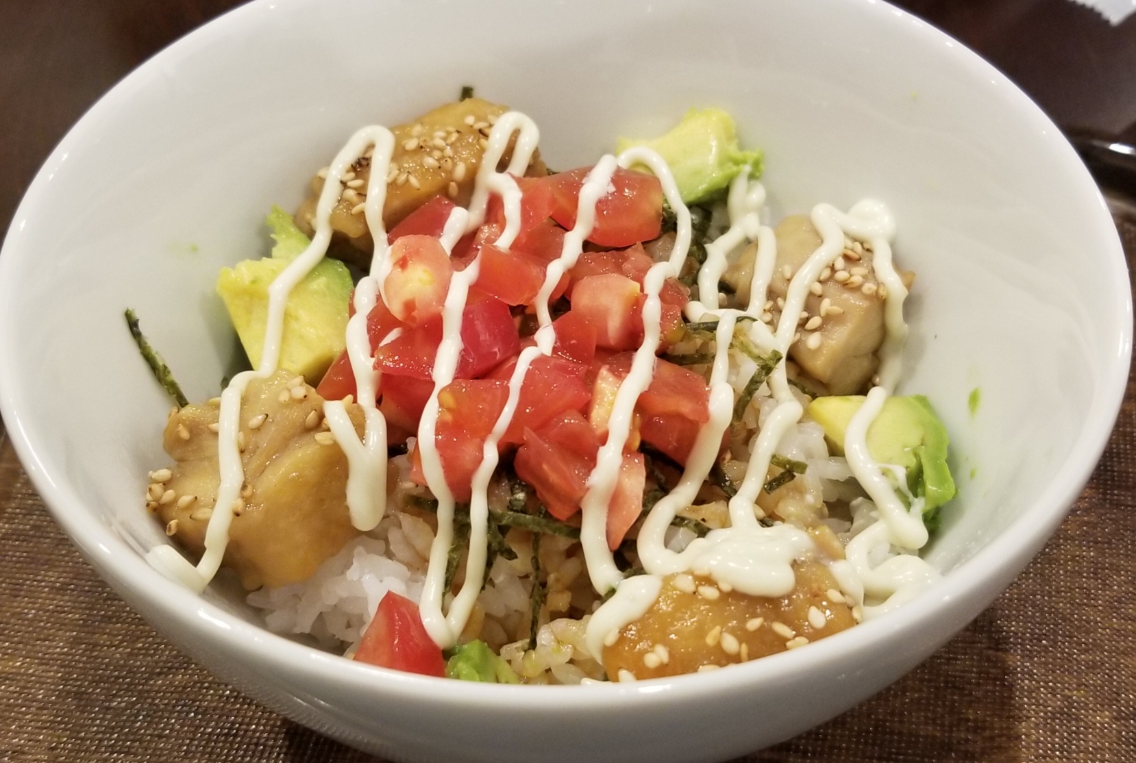 照り焼きチキンとアボカドのわさびマヨご飯650円。