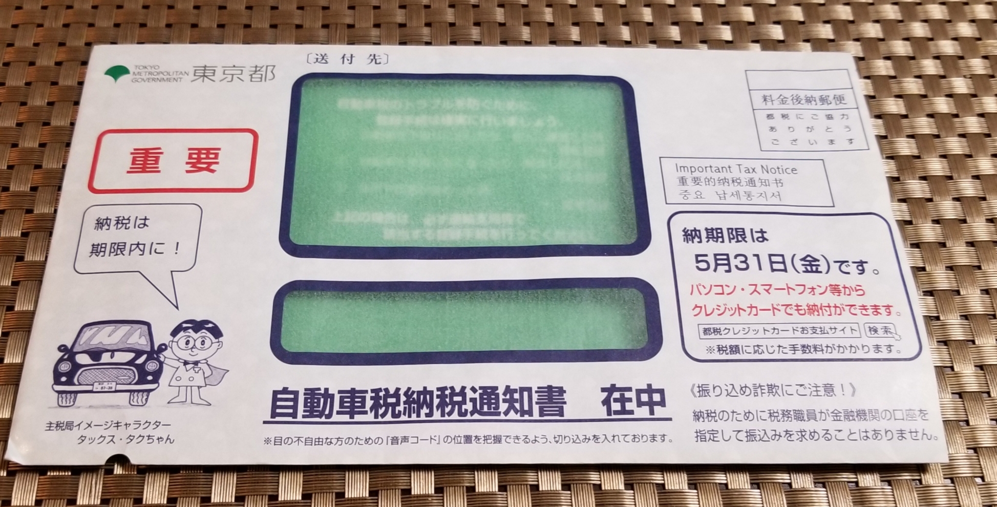 自動車税の納税通知書。