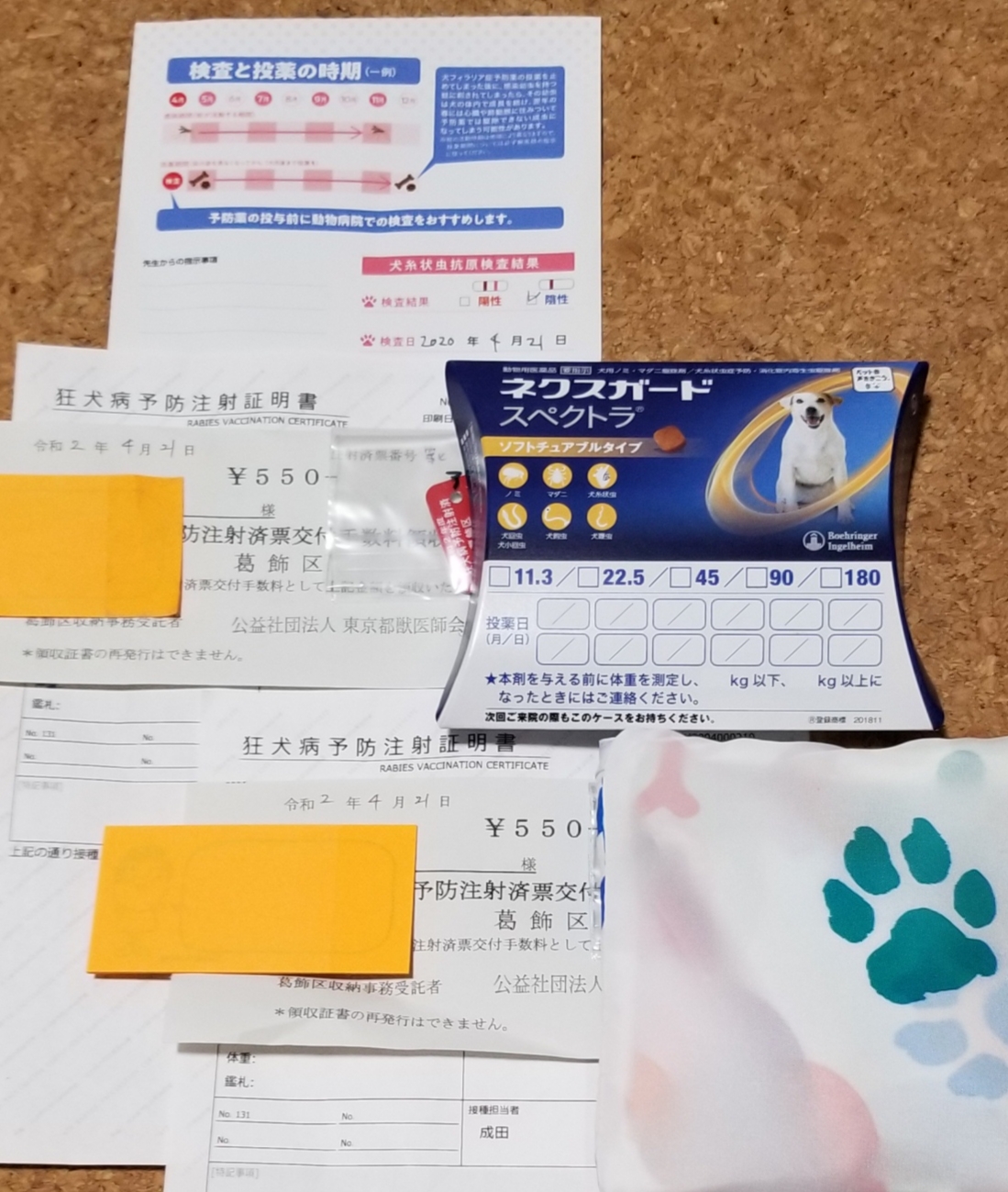 予防注射の証明とフィラリアとダニ除けの薬をもらって帰ってきました。