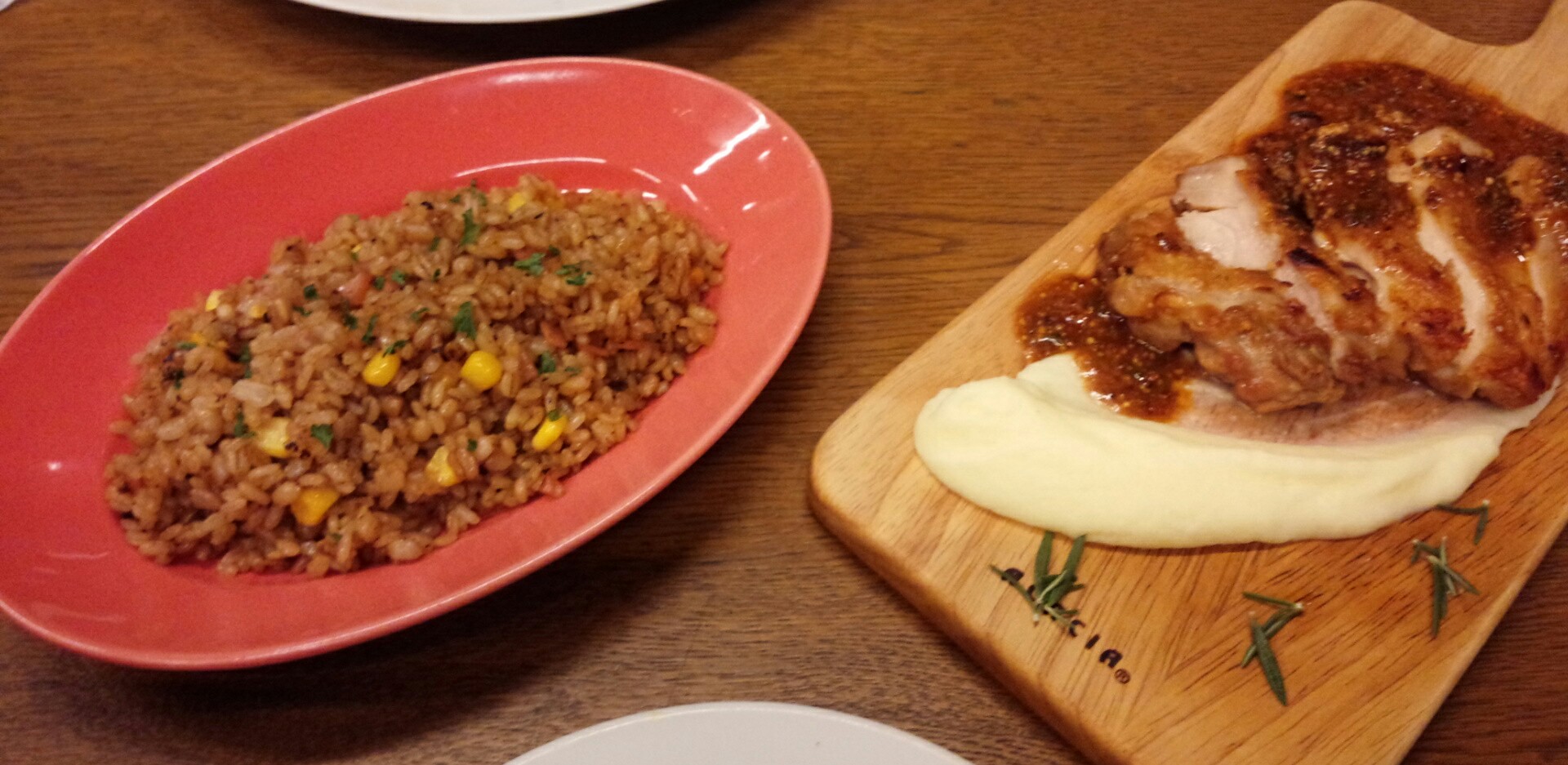 私は保守的に、若鶏もも肉のローストとガーリックライス