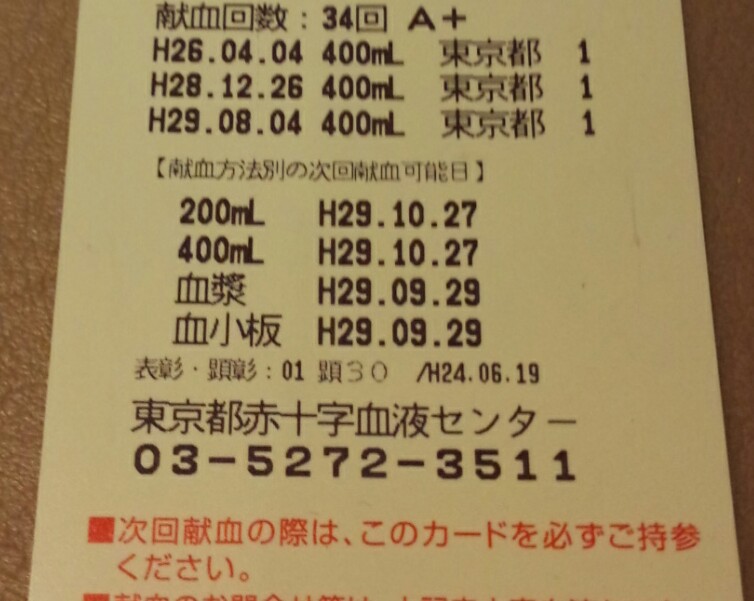 今回は無事クリア、全献血400㏄やってきました。