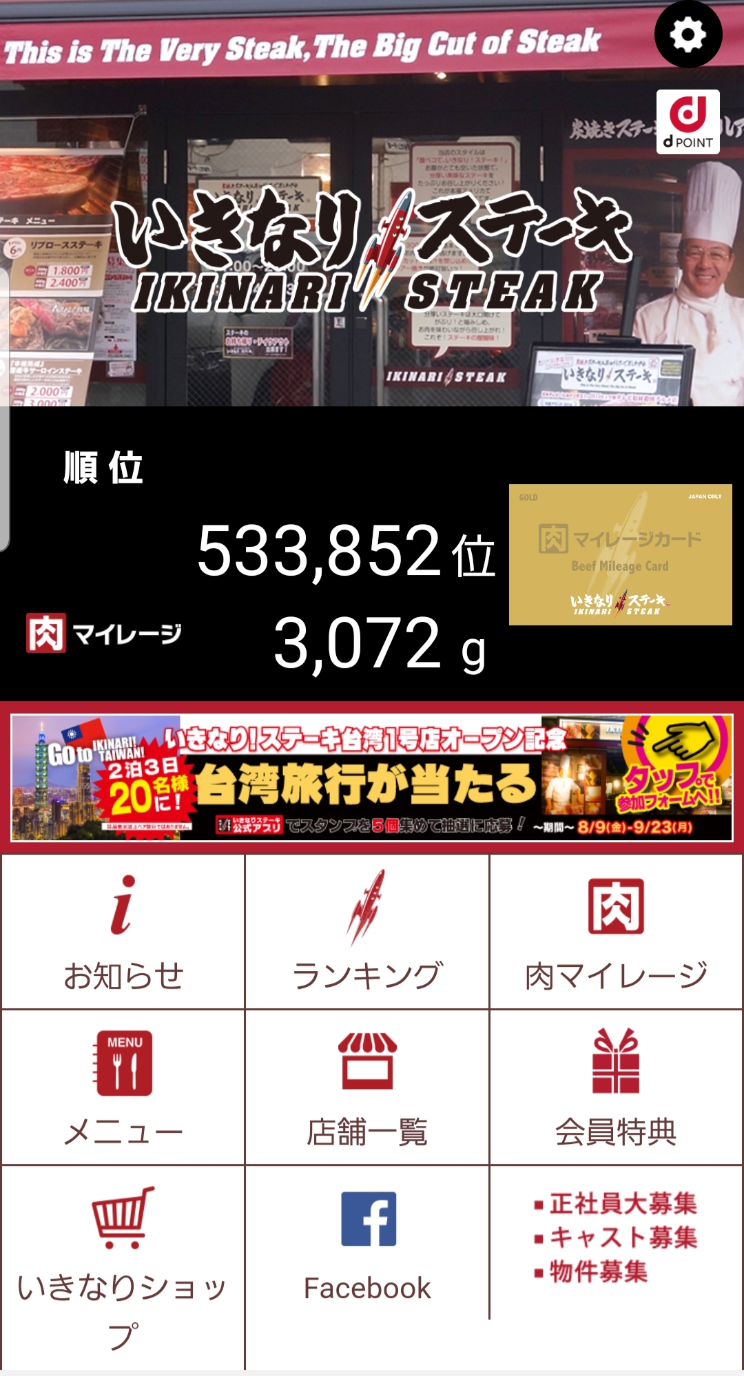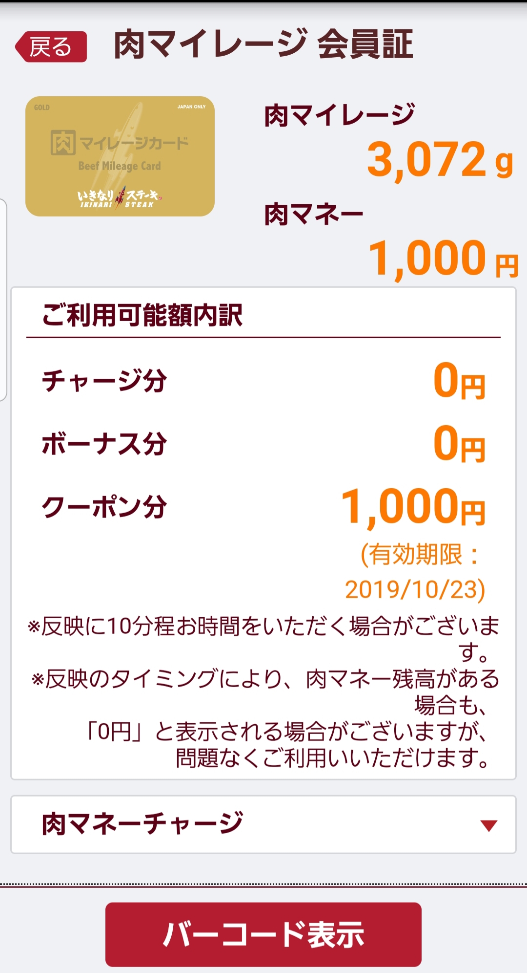 肉マイレージの履歴を見ると1回目は2017/8/23でした。