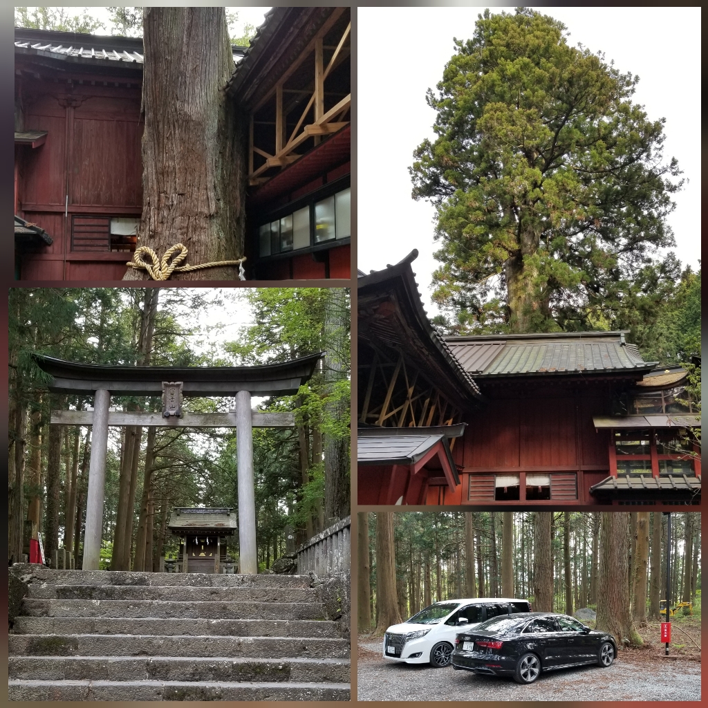 神社を突き抜けている杉の木、裏に回ってみると食い込んでるだけでした。